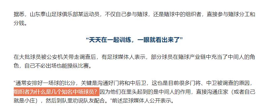 《中國新聞週刊 》還從一位足球媒體人口中瞭解到,山東泰山某位球員不但自己參與賭球,而且還是賭球中的組織者。作爲一名中場球員,他在隊內場上場下都能起到中間人的作用,他直接溝通莊家或者自己就是小莊,然後到隊裏勸說隊友配合。