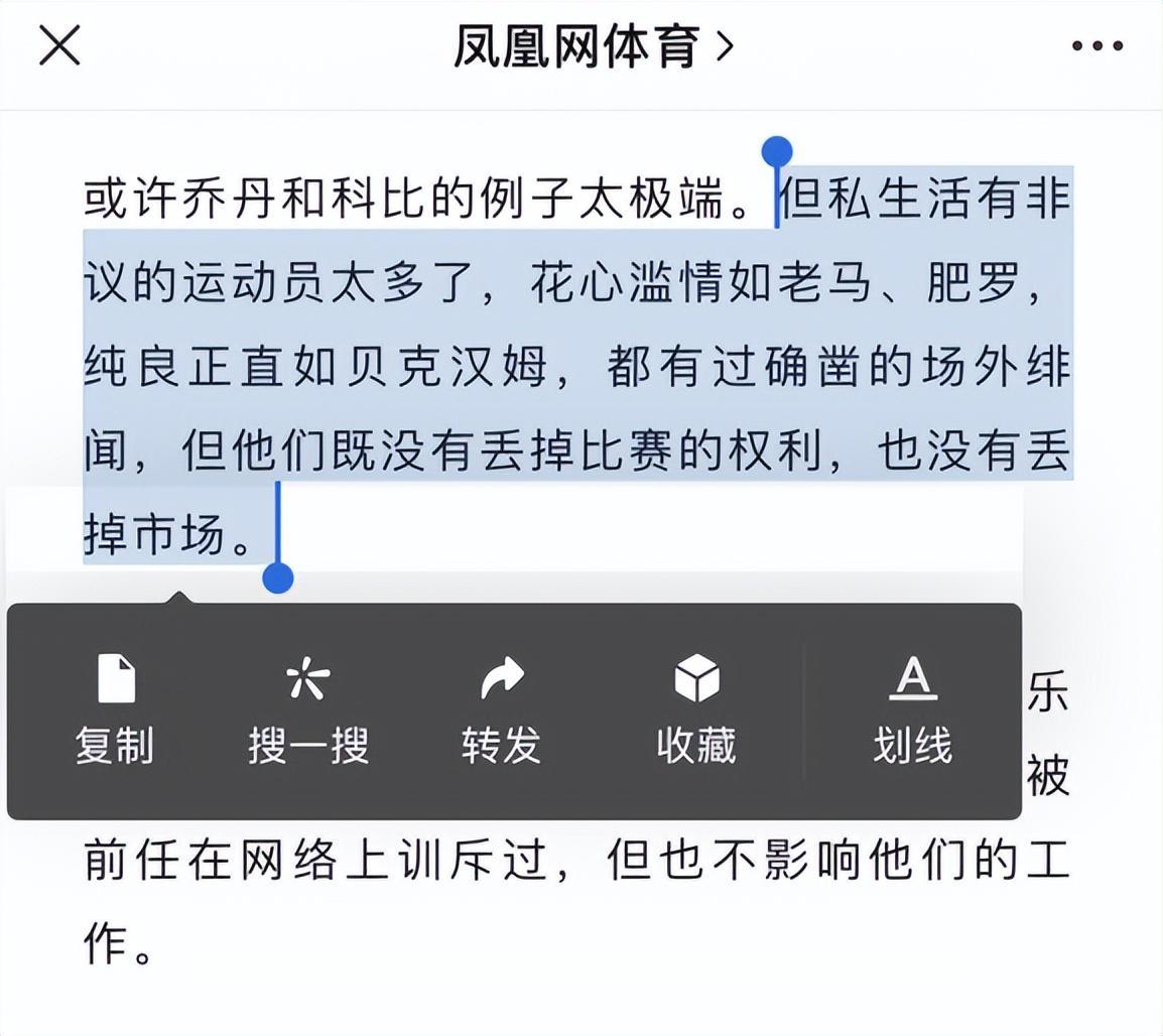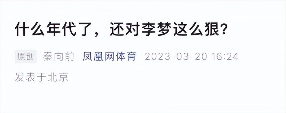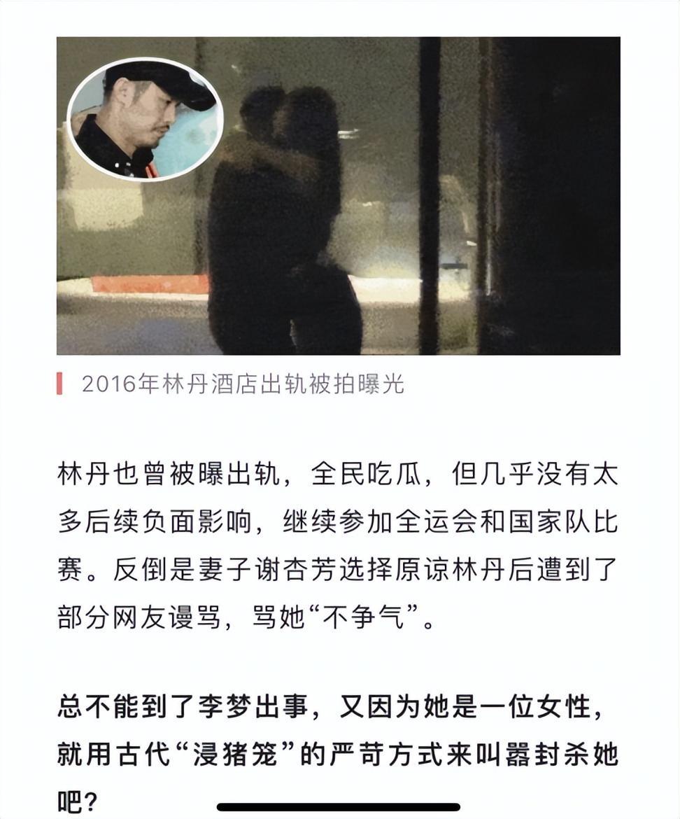 而在昨日,鳳凰網體育也發佈了一篇聲援李夢的文章,標題是《什麼年代了,還對李夢這麼狠》。裏面舉了一些男運動員的混亂私生活例子,籃球界有喬丹、科比和阿里納斯,足球界有馬拉多納、羅納爾多和貝克漢姆,而中國體壇代表則是羽壇一哥林丹以及多名出軌的男足球員。寫了這麼多就是想證明一點,運動員如果不是違法而只是道德上出現問題,就不會被國家隊開除。所以李夢不應該被“浸豬籠”的方式封殺。