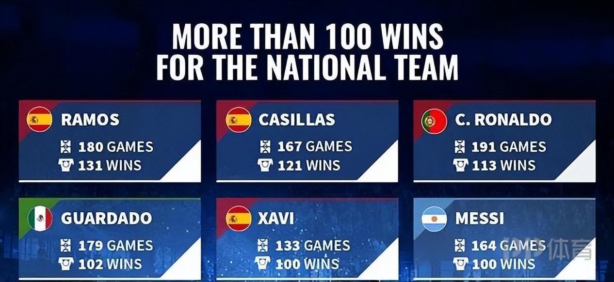 昨日一場友誼賽,阿根廷3-0牙買加,替補雙響的梅西解鎖國家隊100勝,成爲第六名達此成就的球員。德轉盤點了國家隊勝場排行,拉莫斯180場131勝居首,卡西167場121勝第二,C羅191場113勝第三。國家隊勝場排行:1、拉莫斯(西班牙),180場131勝2、卡西(西班牙),167場121勝3、C羅(葡萄牙),191場113勝4、瓜爾達多(墨西哥),179場102勝5、哈維(西班牙),133場100勝6、梅西(阿根廷),164場100勝