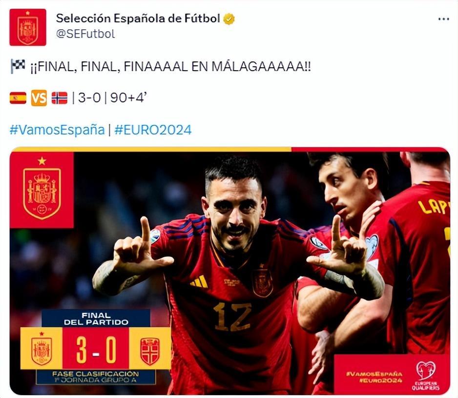 歐預賽A組第一輪,挪威這邊哈蘭德因傷缺陣,厄德高單核出戰;奧爾默在第13分鐘先開記錄,在最後階段替補登場的何塞盧在2分鐘內連進2球,最終西班牙主場3-0輕取挪威,取得歐預賽開門紅。