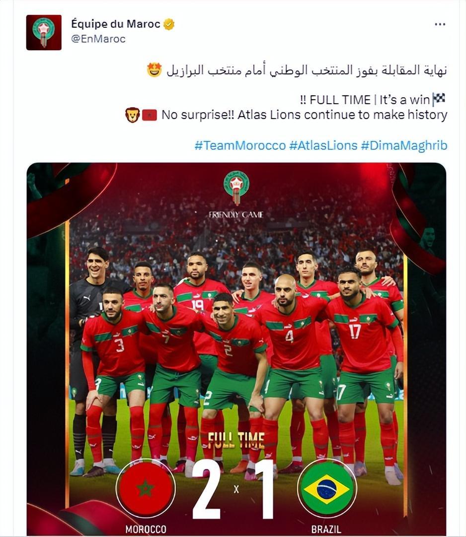 國際友誼賽,卡塞米羅破門難救主,布法爾和薩比裏各進一球,最終巴西1-2爆冷不敵摩洛哥。摩洛哥是卡塔爾世界盃上的最大黑馬,他們在1/4決賽擊敗葡萄牙後成爲了歷史首支闖進世界盃4強的非洲球隊。但跟巴西的這一場熱身賽,他們仍然是被看衰的一方,所以這一場2-1確實是比較冷門的。