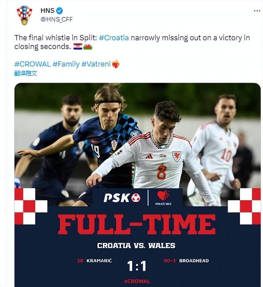 歐預賽D組第一輪,克拉馬里奇首開紀錄,布羅德黑德93分鐘絕平,克羅地亞主場被威爾士逼平1-1,無緣開門紅。