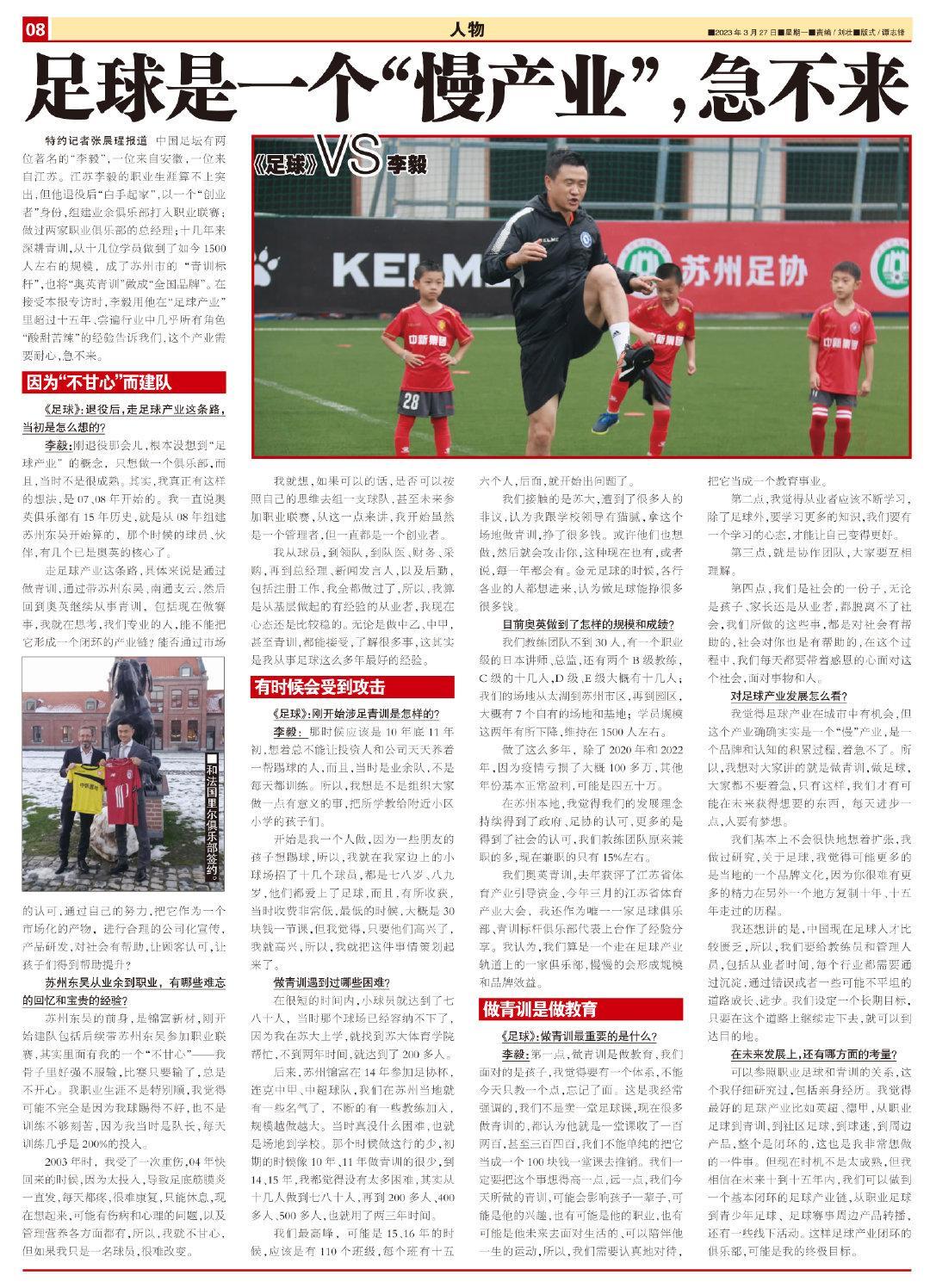 特約記者張晨瑆報道 中國足壇有兩位著名的“李毅”,一位來自安徽,一位來自江蘇。江蘇李毅的職業生涯算不上突出,但他退役後“白手起家”,以一個“創業者”身份,組建業餘俱樂部打入職業聯賽;做過兩家職業俱樂部的總經理;十幾年來深耕青訓,從十幾位學員做到了如今1500人左右的規模,成了蘇州市的“青訓標杆”,也將“奧英青訓”做成“全國品牌”。在接受本報專訪時,李毅用他在“足球產業”裏超過十五年、嚐遍行業中幾乎所有角色“酸甜苦辣”的經驗告訴我們,這個產業需要耐心,急不來。