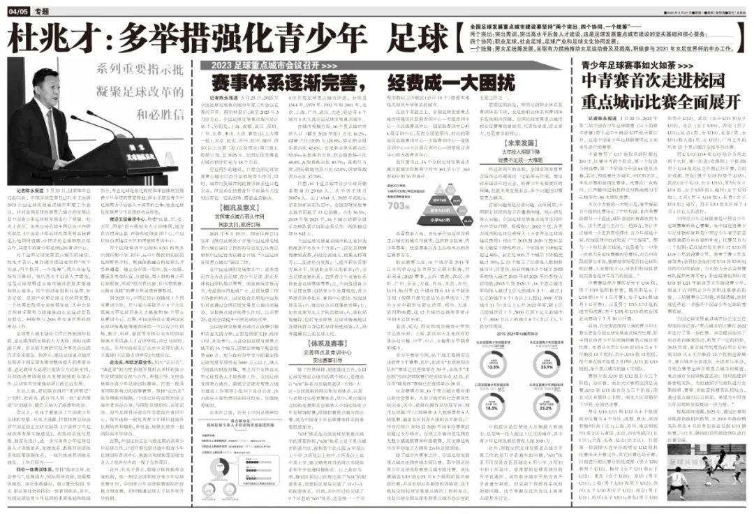 此外,杜兆才表示,要建立體育教育會商機制,統一制定全國和地方青少年足球競賽日曆,中國青少年足球聯賽要組織好地方預選賽,同時暢通足球人才培養和升學機制。
