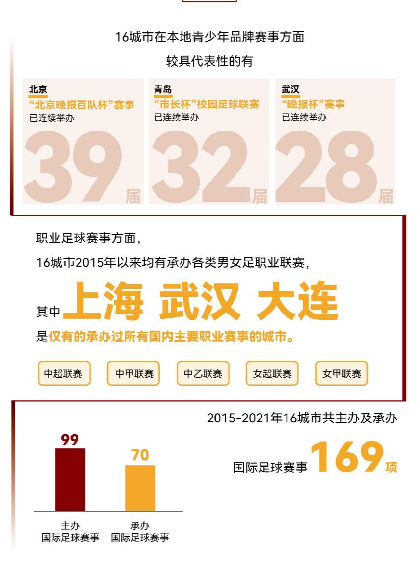 職業聯賽方面,16個城市自2015年以來均承辦過各類男女足職業聯賽,目前來看,2023賽季,上海、成都、武漢、深圳、廣州、長春、大連、青島、北京、蘇州、杭州、梅州等12個城市擁有13支中超俱樂部(按照目前完成清欠名單統計),另外5家中超俱樂部在濟南、鄭州、天津、滄州和南通,這12個城市還擁有多家中甲和中乙俱樂部。