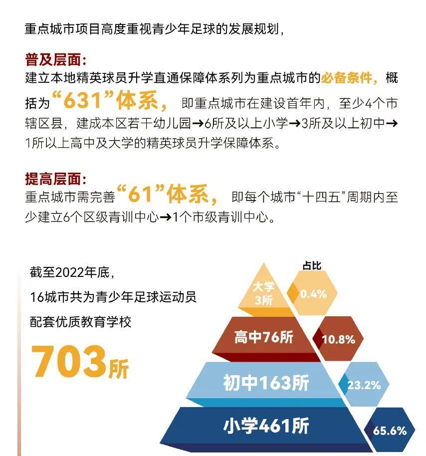 至目前爲止,16個全國足球發展重點城市配套優質教育學校爲461所小學、163所初中和76所高中。