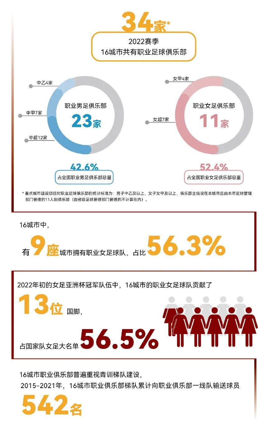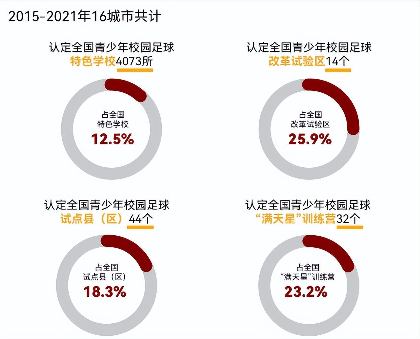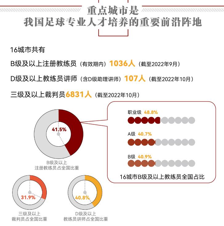 在城市規模方面,16個重點城市常駐人口(截至2021年底)佔比16.2%,GDP佔比(2021年)26.8%,男足職業俱樂部佔比42.6%,女足職業俱樂部佔比52.4%;在教練員方面,職業級教練佔比48.8%,A級教練佔比40.7%;裁判員方面,國際級裁判員佔比62.5%,國家級裁判員佔比37.79%。