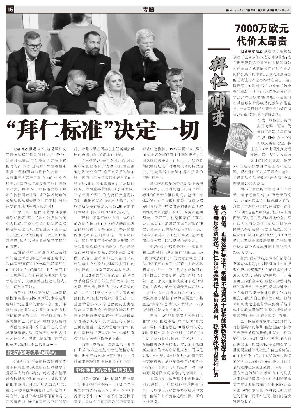 兩年前卡恩和薩利哈米季奇將納格爾斯曼帶到安聯球場,本意是帶給拜仁銳意進取的青春氣息。但並不意味着,要用失去對德甲的統治力和悖逆傳統作爲代價。在馬特烏斯、埃芬博格和巴貝爾看來,納格爾斯曼的下課絲毫不意外:德甲亞軍在安聯球場就意味着失敗,歐冠至少要進入四強纔是合格。在其他俱樂部可以容忍的東西,在拜仁不會被容忍……