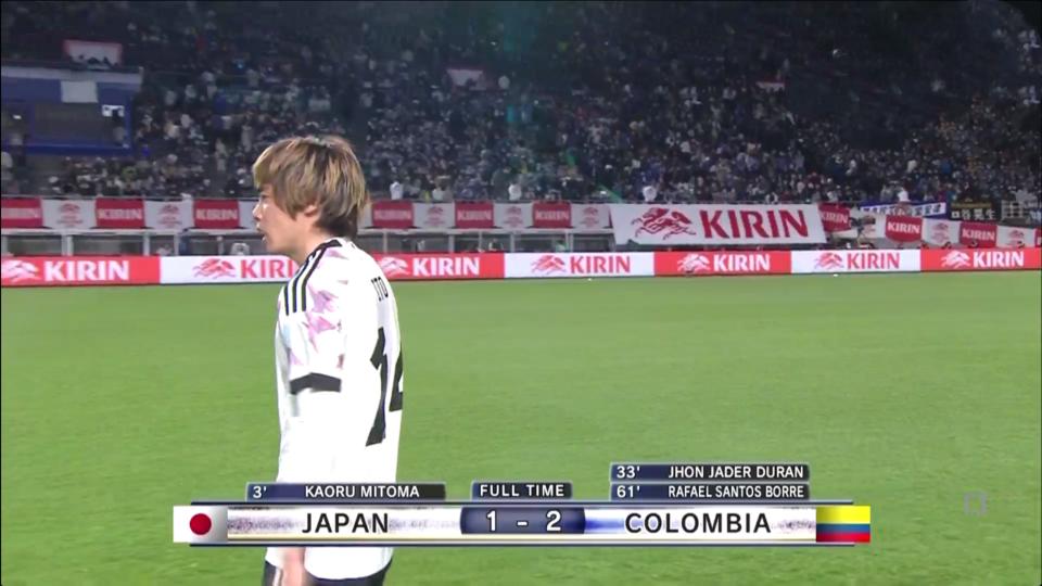北京時間3月28日18:20,麒麟杯挑戰賽第二場,日本主場迎戰另一支南美勁旅哥倫比亞。上半場,開場僅3分鐘,三笘薫接應守田英正傳中頭球建功;第33分鐘,19歲小將杜蘭推射破門幫助哥倫比亞扳平比分。易邊再戰,第61分鐘,博雷倒鉤破門幫助哥倫比亞反超比分。最終,哥倫比亞客場2比1逆轉日本取勝。