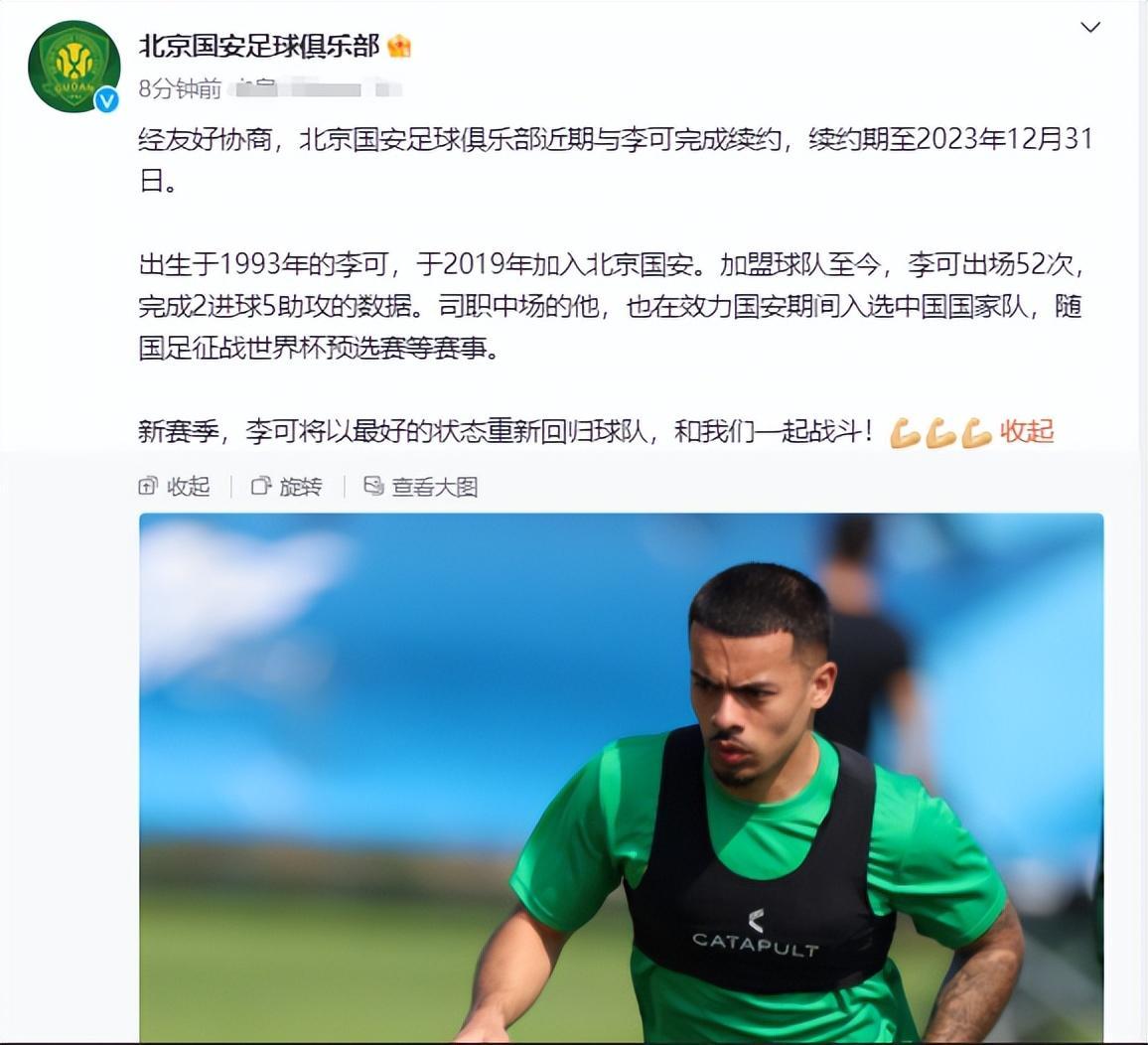 北京時間3月30日上午,北京國安官方宣佈跟李可完成續約,合同到今年年底到期。