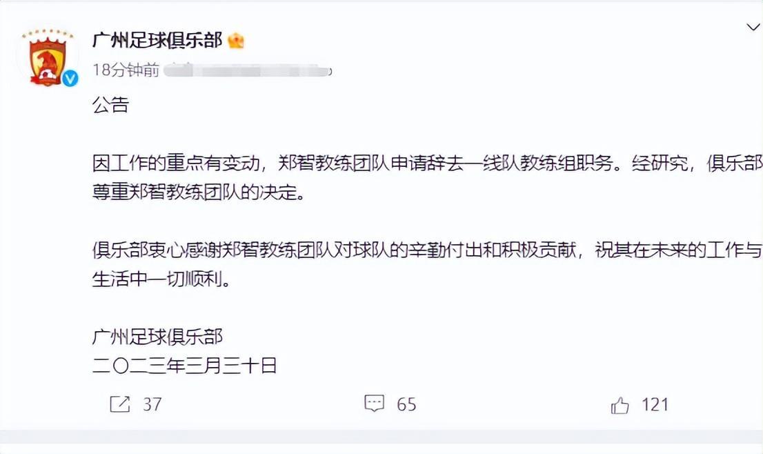 北京時間3月30日晚上,廣州隊官方宣佈鄭智教練團隊集體辭職,也就是說包括黃博文、梅方和張成林也將離開。