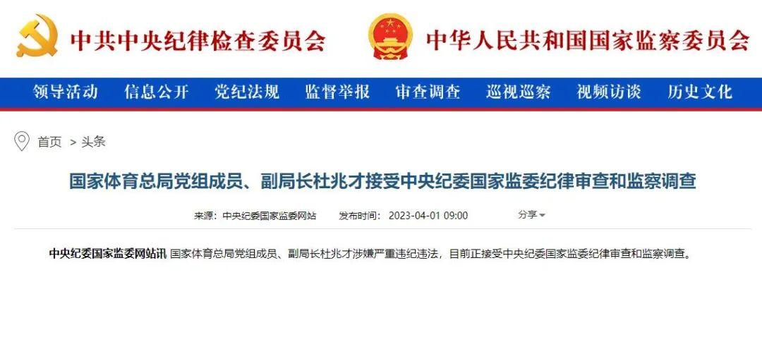 記者程善報道 4月1日上午9點,中央紀委國家監委網站官方宣佈,國家體育總局黨組成員、副局長杜兆才涉嫌嚴重違紀違法,目前正接受中央紀委國家監委紀律審查和監察調查。