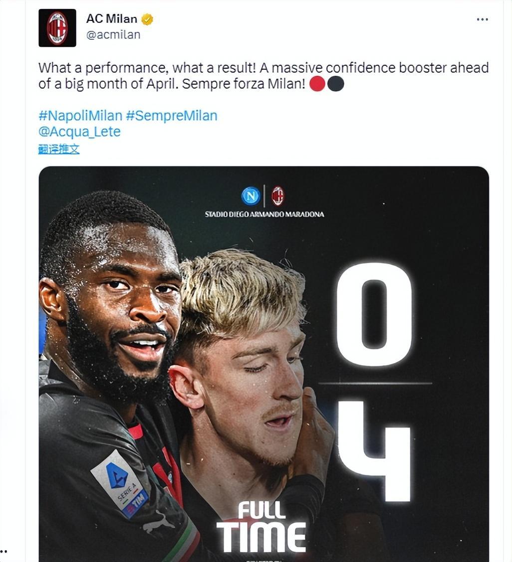 在三小時前,穆里尼奧執教的羅馬在主場3-0大勝桑普多利亞後,AC米蘭被擠出了前四。但這支歐冠7冠王在絕境爆發,用一場4-0橫掃那不勒斯,甚至反超了同城死敵國米,上升至聯賽第3的位置,而羅馬則只在歐冠區不到坐了3小時。