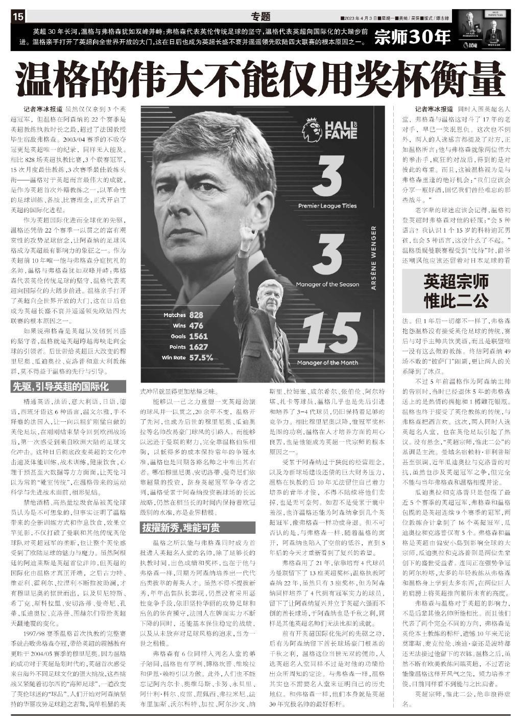 記者寒冰報道 雖然僅僅拿到3個英超冠軍,但溫格在阿森納的22個賽季是英超教練執教時長之最,超過了法國教授畢生宿敵弗格森。2003/04賽季的不敗奪冠更是英超唯一的紀錄,同樣無人能及。相比828場英超執教比賽,3個聯賽冠軍,15次月度最佳教練,3次賽季最佳教練頭銜——溫格對於英超而言最偉大的成就,是作爲英超首次外籍教練之一,以革命性的足球訓練、備戰、比賽理念,正式開啓了英超的國際化進程。