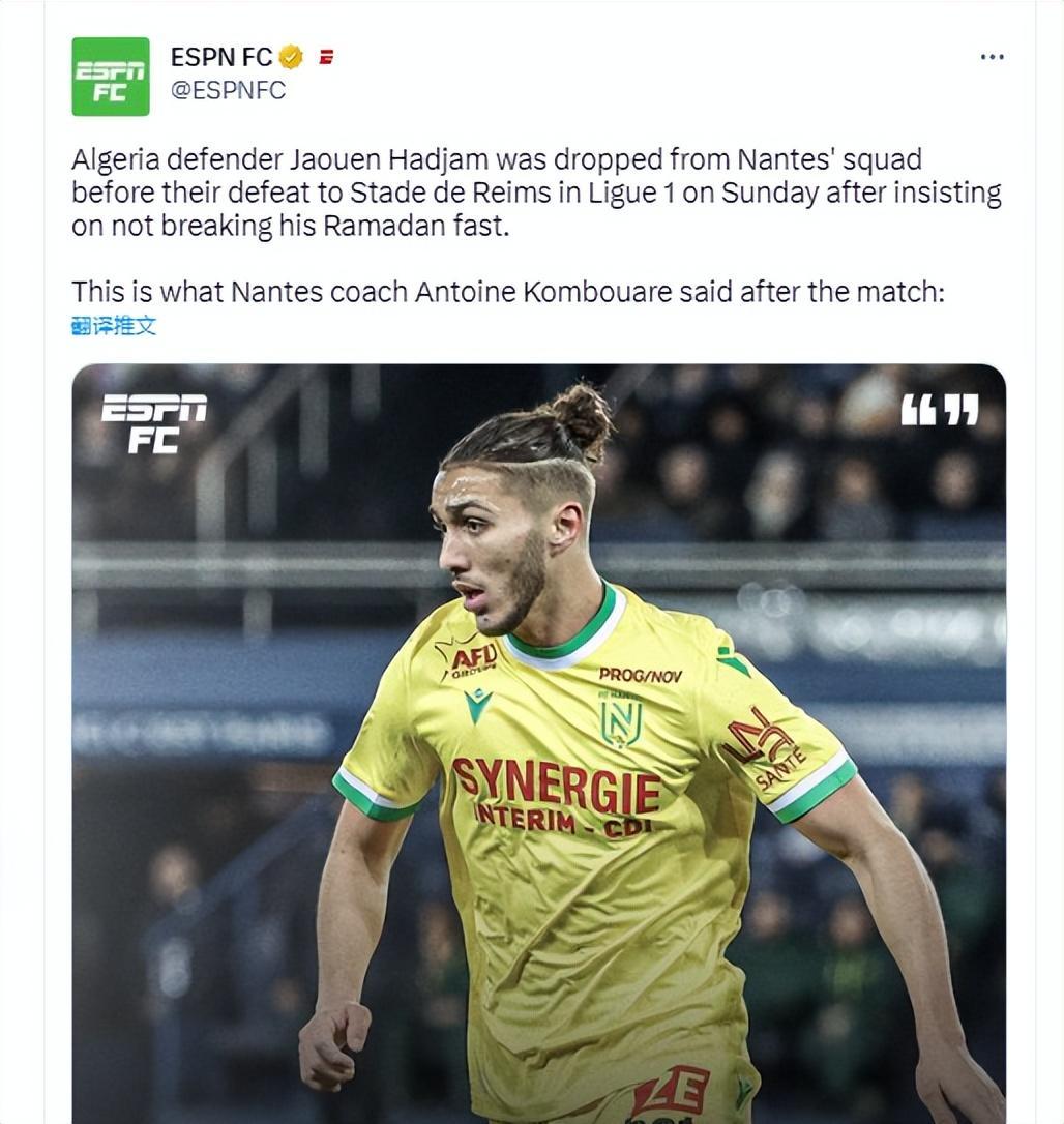 北京時間4月4日,ESPN報道稱,20歲阿爾及利亞國腳阿賈姆因爲堅持齋月禁食,被球隊踢出比賽大名單。