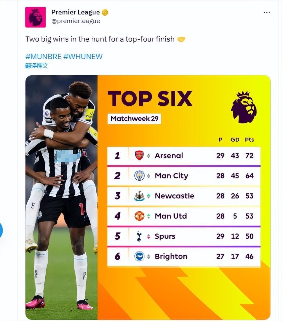 自三月初客場0-2不敵曼城之後,紐卡斯爾最近4輪聯賽保持全勝,全取12個積分。現在,他們以淨勝球優勢力壓曼聯坐穩聯賽第3位,並且在少賽一輪的情況下仍然領先熱刺3分。當然,另外兩家豪門球隊利物浦和切爾西也排在他們的身後。