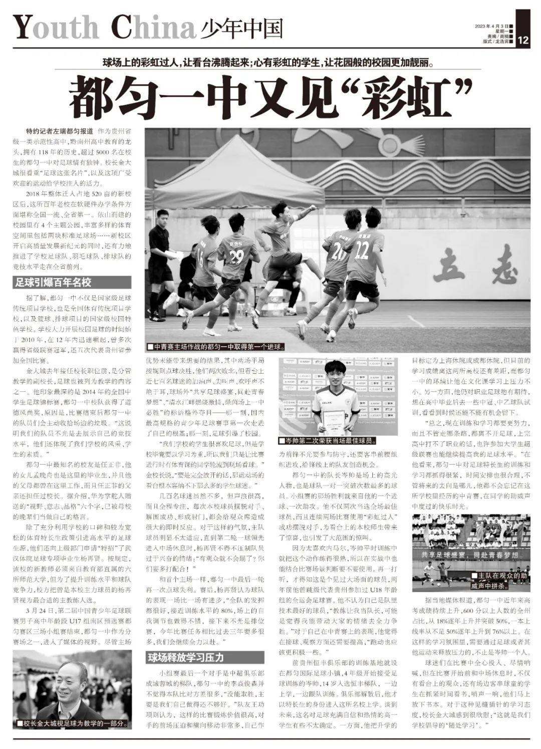 “總之,現在訓練和學習都要更努力,而且不管走哪條路,都離不開足球,上完高中打不了職業的話,也許參加大學生超級聯賽也能繼續提高我的足球水平。”在他看來,都勻一中對足球特長生的訓練和學習都抓得很緊,時間安排也很合理,不管將來的去向是哪兒,他都不會忘記在這所學校裏經歷的中青賽,在同學的助威聲中度過的快樂時光。