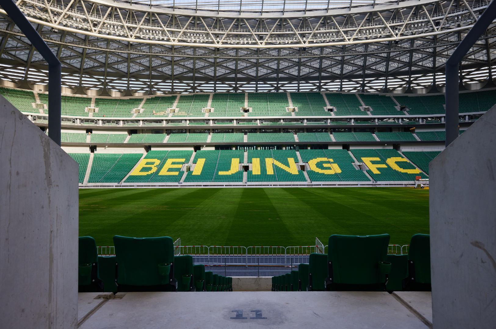 巨大的“BEIJINGFC”的字樣,象徵着這座球場的主人,球場整體是國安的綠色主題,爲了迎接揭幕戰,草皮已經以最快的速度經過了完善。