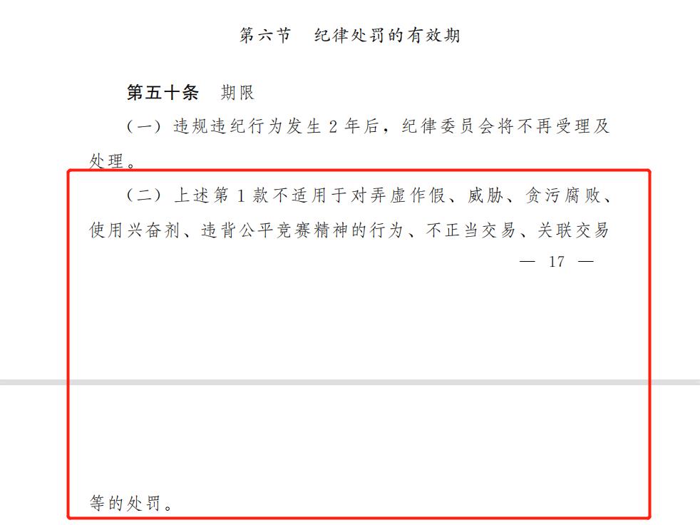 根據中國足協2022年版《紀律準則》第五十條的規定,紀律處罰有一個有效期限,違規違紀行爲發生2年後,紀律委員會將不再受理;但這個條款,不適用於弄虛作假,威脅,貪污腐敗,使用興奮劑,違背公平競賽精神,不正當交易和關聯交易等行爲的處罰。也就是說,如果有球隊在這次反腐打擊假球和賭球中涉案,與上述不適用的條款相關,還是會受到處罰。
