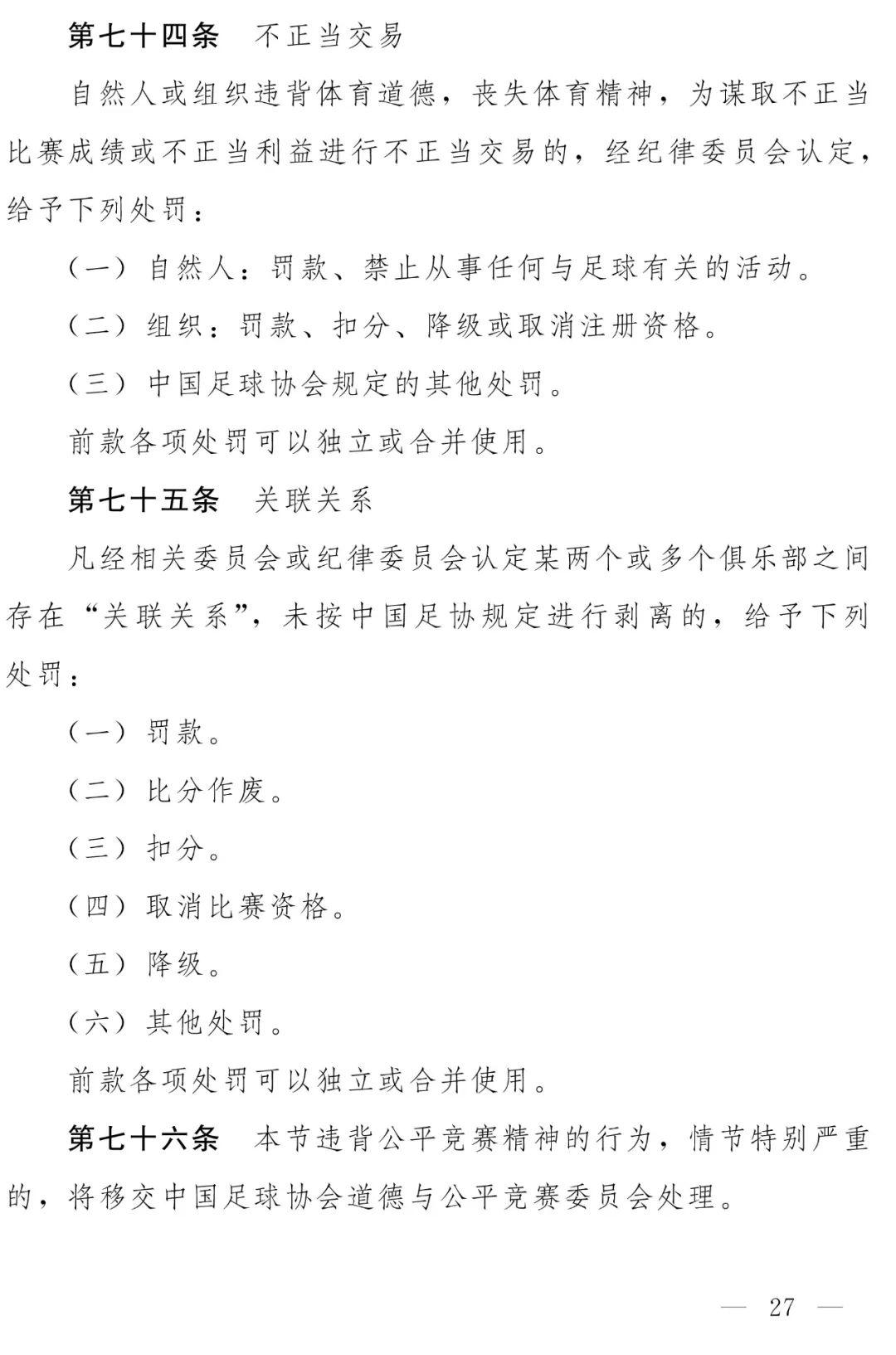 而關於處罰方式,《紀律準則》第七十二條“其他弄虛作假行爲”、第七十三條“嚴重違背公平競賽精神”、以及第七十四條“不正當交易”中都有相關規定,包括對自然人的“警告、通報批評、罰款、停賽、禁止轉會、取消註冊資格、禁止從事任何與足球有關的活動”,對球隊的“罰款、禁止轉會、扣分、降級、取消註冊資格等以及其他處罰”。