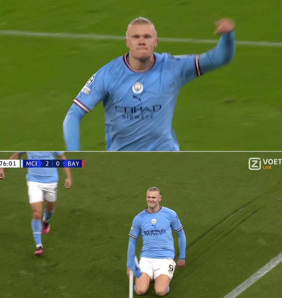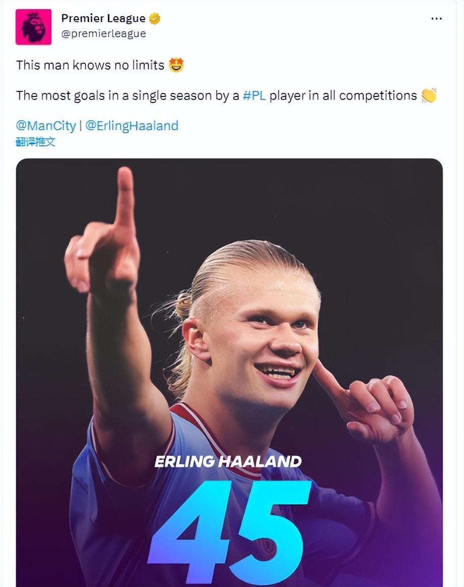 在最近5場各項賽事,22歲的哈蘭德直接參與了13粒進球(12球1助攻)。而這個夜晚在伊蒂哈德面對拜仁的這一球,是他本賽季歐冠第7次出場打進的第11球,他的歐冠總進球數已經上升至34球。這也是哈蘭德在曼城處子秀賽季打進的第45球,他打破了範尼和薩拉赫共同保持的44球紀錄,成爲了單賽季進球最多的英超球員。英超官方感嘆:“這個男人沒有上限!”