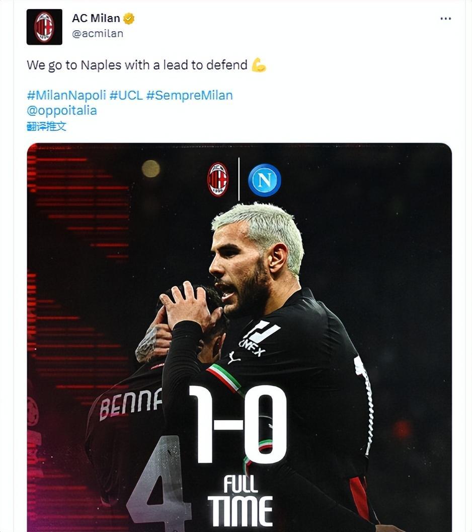 歐冠1/4決賽首回合,憑藉本納賽爾打進的全場唯一進球,AC米蘭主場1-0戰勝那不勒斯,佔得晉級先機。