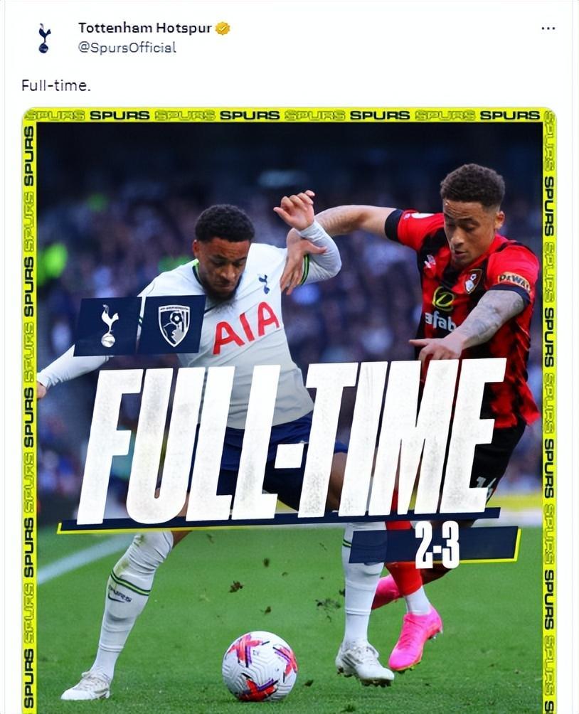 英超第31輪,孫興慜首開記錄難救主,瓦塔拉第95分鐘絕殺,最終熱刺主場慘遭伯恩茅斯3-2逆轉,終止4輪不敗。目前,熱刺在多賽兩輪的情況下仍然落後聯賽第4的曼聯3分。