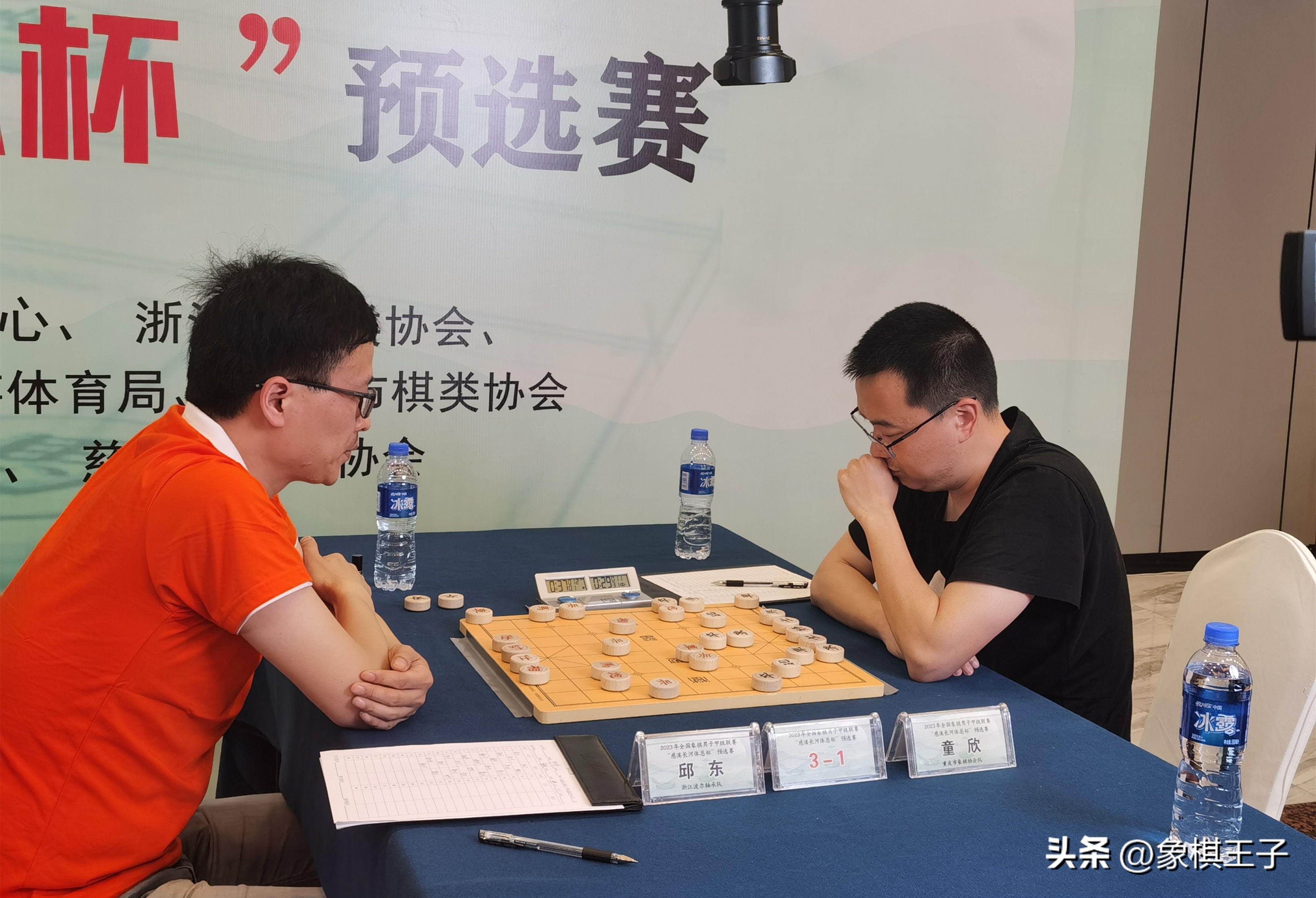 其中邱東與童欣之仗,邱東執紅棋仙人指路對起馬,紅方兩頭蛇,主動出擊,沒幾步棋就左炮過河,壓入黑棋內線。