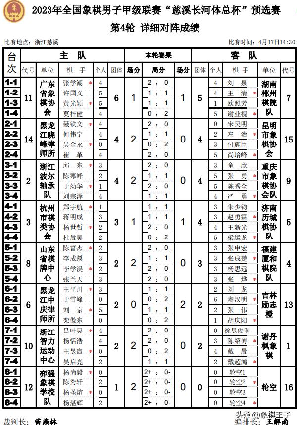 4月17日,2023年全國象棋男子甲級聯賽“慈溪長河體總杯”預選賽在浙江慈溪戰罷第二日的比賽,四輪過後,廣東隊積7分獨居第一,位列榜首,東道主浙江波爾軸承隊發揮出色,與湖南隊、黑龍江隊,三支隊伍同積6分,濟南隊5分。