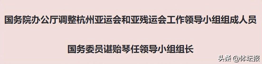 據中國政府網消息,爲做好第19屆亞運會和第4屆亞殘運會籌辦工作,日前國務院辦公廳下發通知,決定對第19屆亞運會和第4屆亞殘運會工作領導小組(以下簡稱領導小組)組成人員等進行調整。國務委員諶貽琴任領導小組組長。