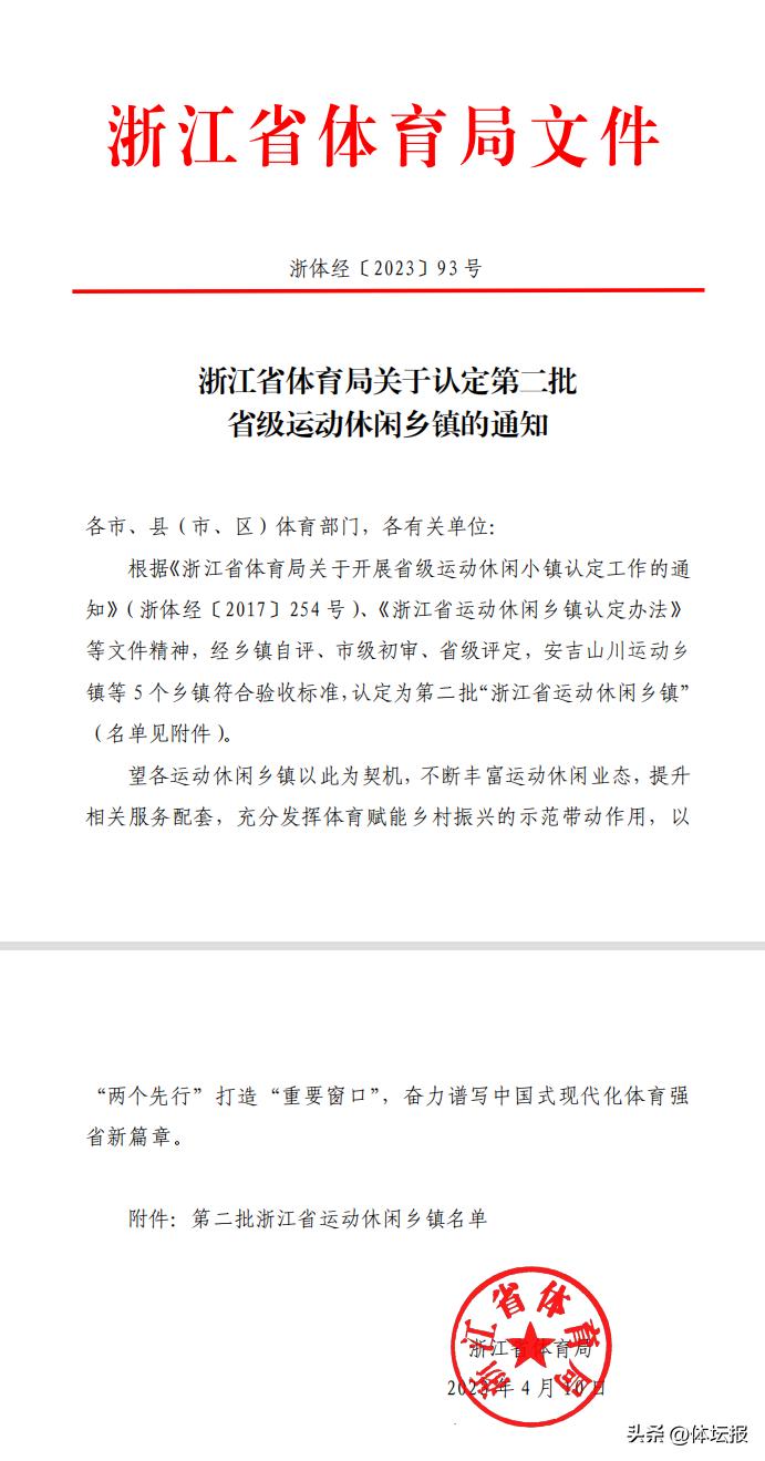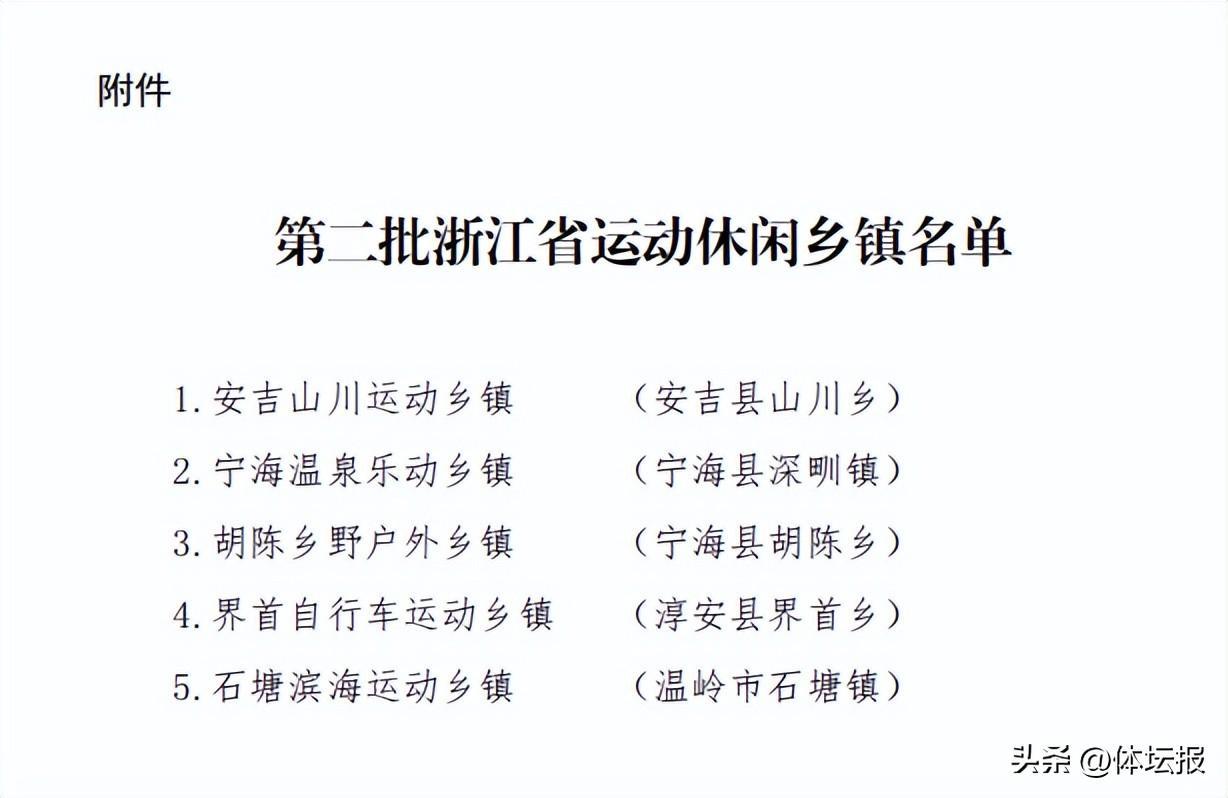 日前,省體育局正式發佈第二批省級運動休閒鄉鎮的認定名單,共有5個鄉鎮符合標準,認定爲第二批省級運動休閒鄉鎮,分別是:安吉山川運動鄉鎮(安吉縣山川鄉)、寧海溫泉樂動鄉鎮(寧海縣深甽鎮)、胡陳鄉野戶外鄉鎮(寧海縣胡陳鄉)、界首自行車運動鄉鎮(淳安縣界首鄉)和石塘濱海運動鄉鎮(溫嶺市石塘鎮)。