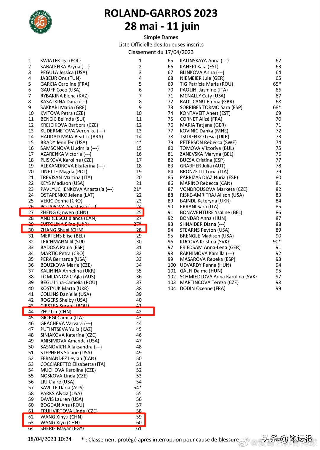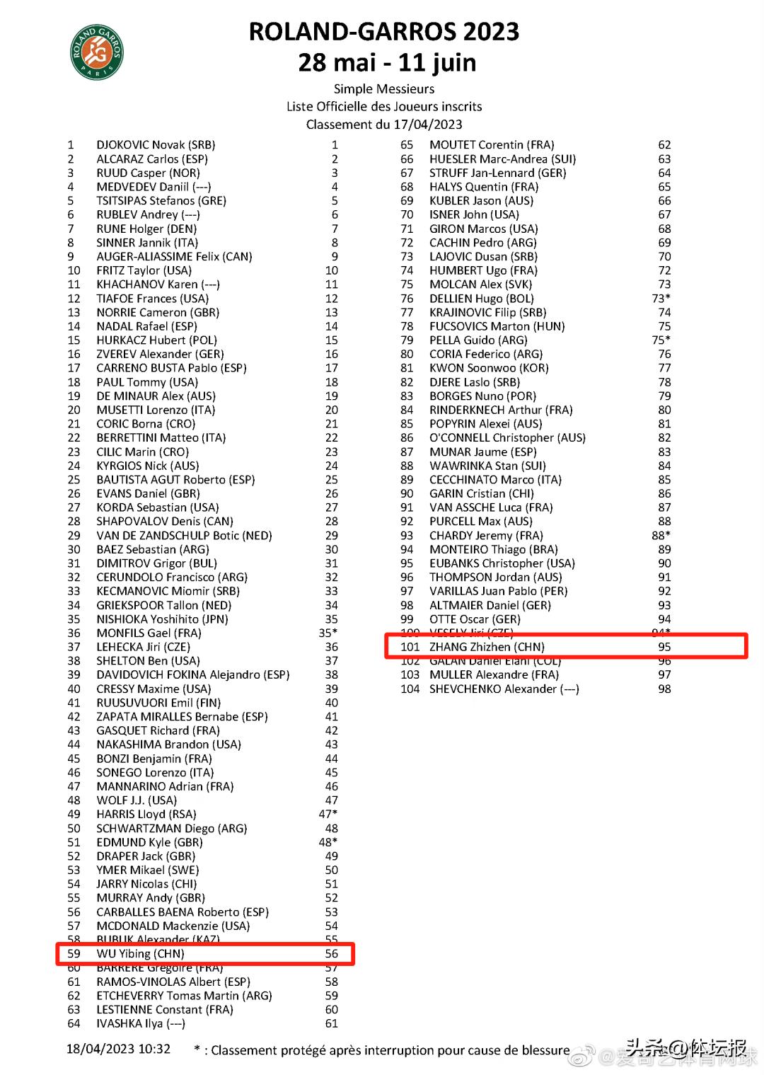 北京時間4月18日晚,法國網球公開賽官方公佈了2023年度正賽參賽名單。本週ATP排名前98位的球員直接入圍。在這個規則下,共有7位中國選手入圍正賽,其中有鄭欽文、張帥、朱琳以及王曦雨和王欣瑜5位女子選手,2位男子選手分別是吳易昺和張之臻,他們也成爲了前2位通過排名直接入圍法網正賽的中網協男子選手。