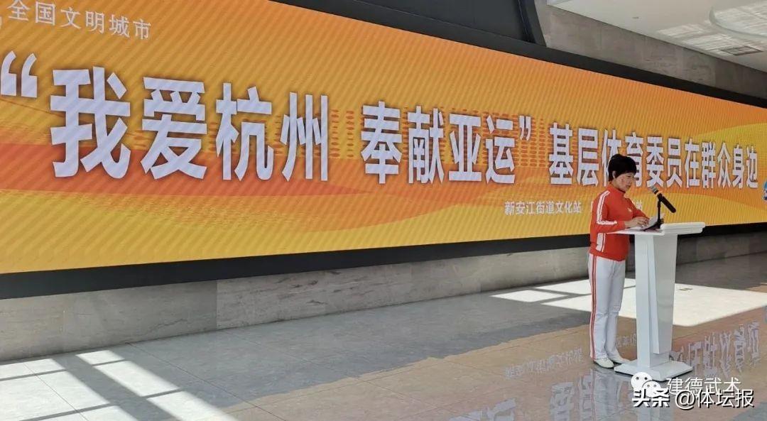 爲營造迎亞運氛圍,建德市文明實踐中心熱鬧非凡,大屏幕中《我愛杭州 奉獻亞運 體育委員在你身邊》的紅字分外燿眼。