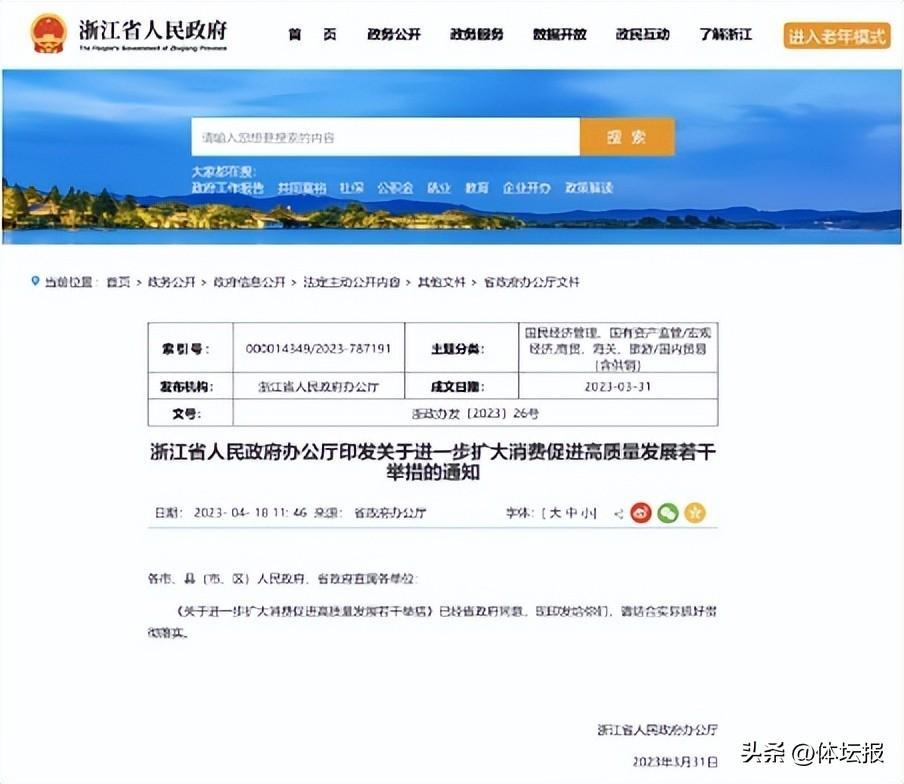 拓展新型主題消費、鞏固提升傳統消費、提質擴容服務消費、助力企業開拓國內市場、打造高品質消費場景、提高商貿流通效率——浙江省人民政府網站4月18日公佈《浙江省人民政府辦公廳印發關於進一步擴大消費促進高質量發展若干舉措的通知》(以下簡稱《通知》)。明確要求,發展賽事經濟,鼓勵發放亞運消費券,做強亞運體育消費。