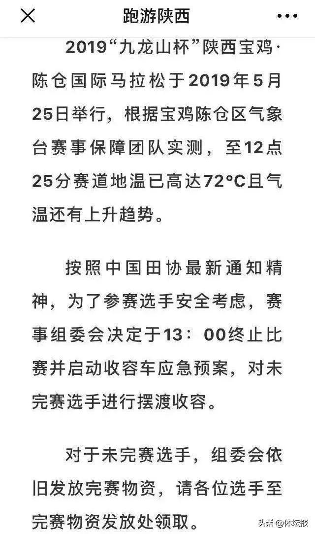 2019年,中國田協發佈《關於加強近期全國馬拉松及相關運動賽事競賽組織安全的通知》(下簡稱《通知》),其中就明確提出了在遭遇雷暴、冰雹、極端高溫、颱風等惡劣天氣條件下,取消、終止、延期比賽的要求。在《通知》下發不久,當年的陝西寶雞陳倉國際馬拉松賽就因爲天氣高溫而終止比賽,這也是中國馬拉松歷史上首次因高溫而終止比賽。