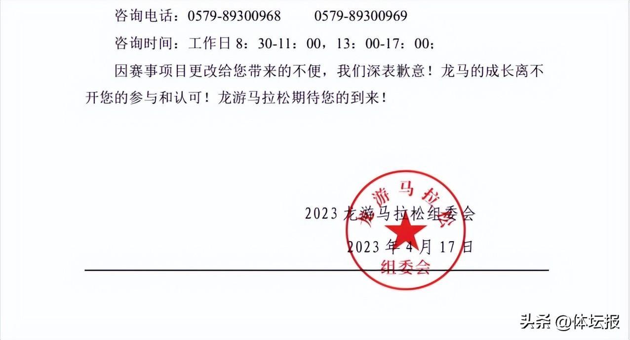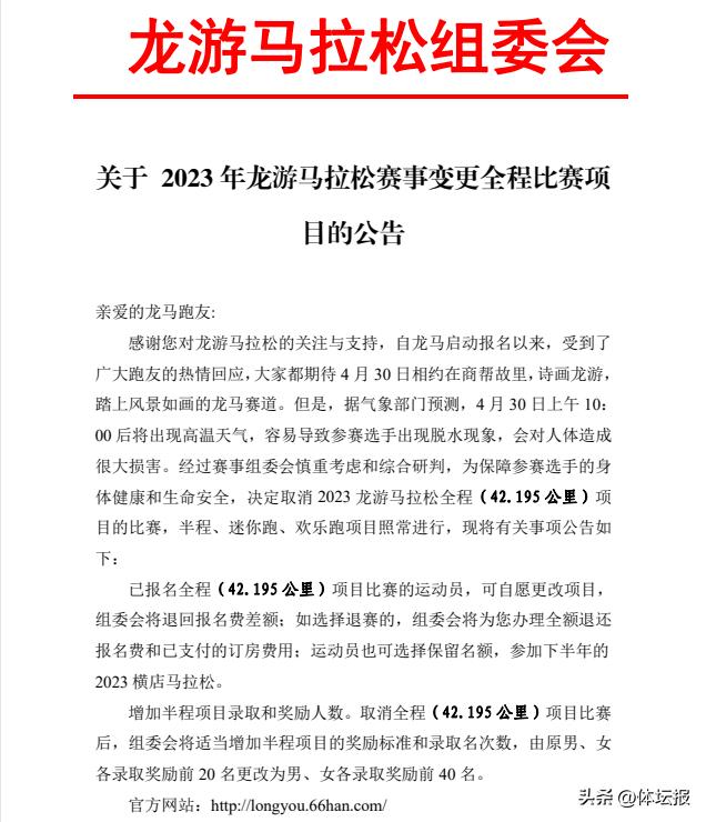 近日,龍游馬拉松組委會發出通知,由於比賽當日將出現高溫天氣,組委會經慎重考慮和綜合研判,決定取消2023龍游馬拉松全程(42.195公里)項目的比賽,半程、迷你跑、歡樂跑項目照常進行。通知一經發出,大部分跑友都表示理解,並且點讚了組委會的做法。