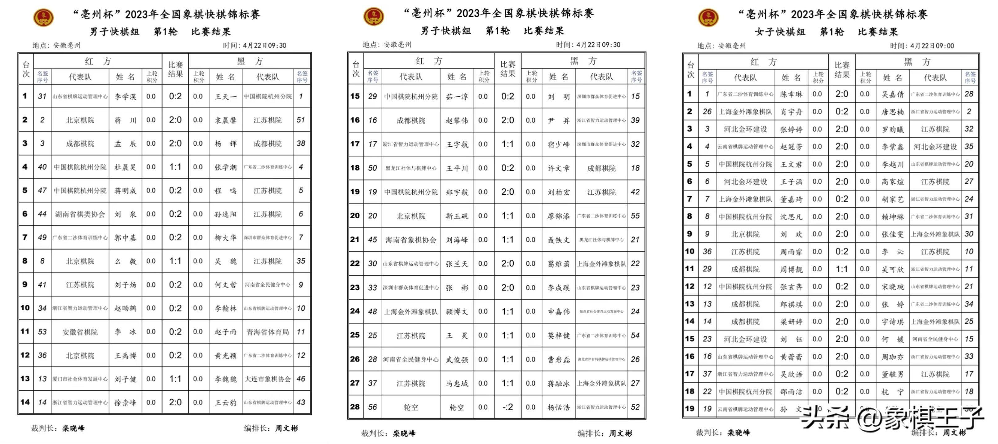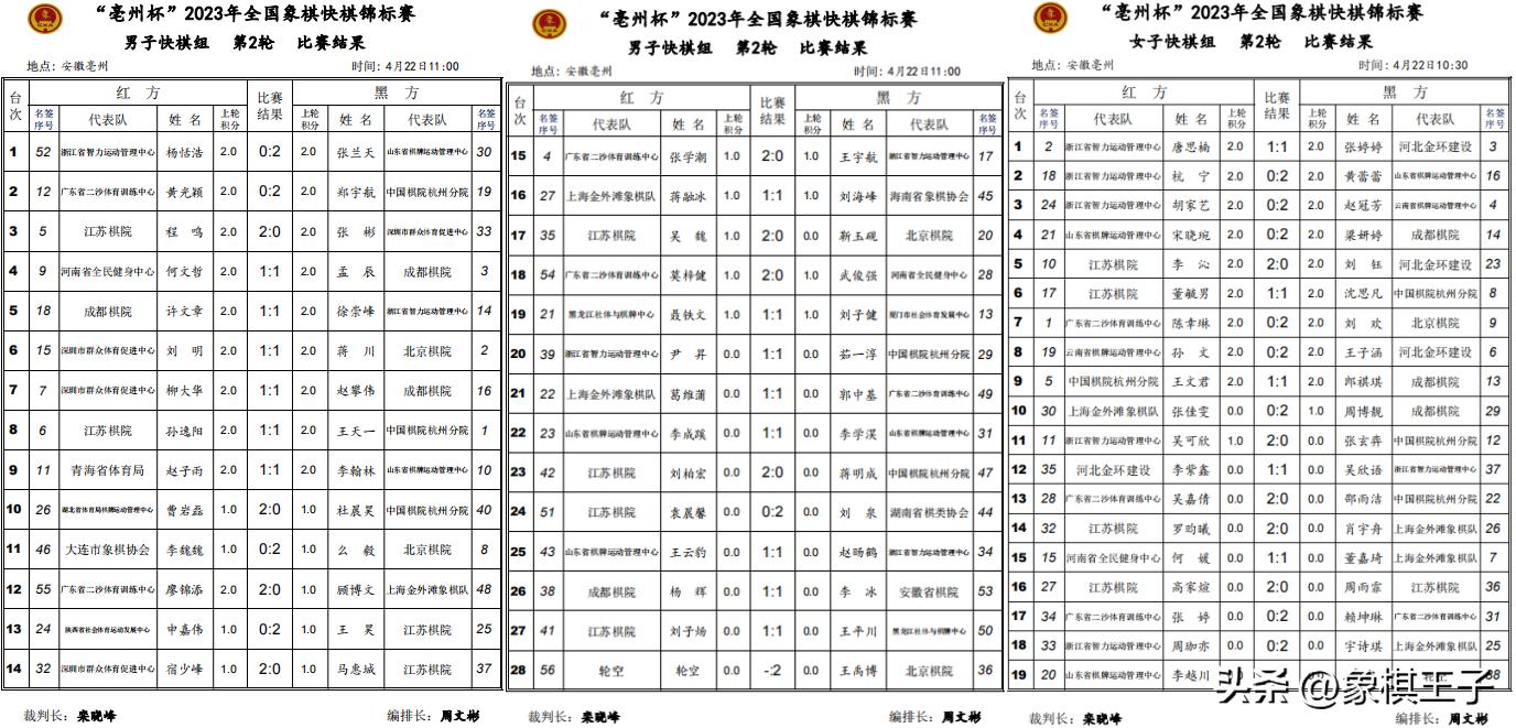 4月22日,2023年全國象棋快棋錦標賽在安徽亳州戰罷前兩輪的角逐,男子組中,程鳴等四人連勝,王天一、蔣川、柳大華等18人一勝一平,女子組梁妍婷等二連勝,象棋王子全程直播。