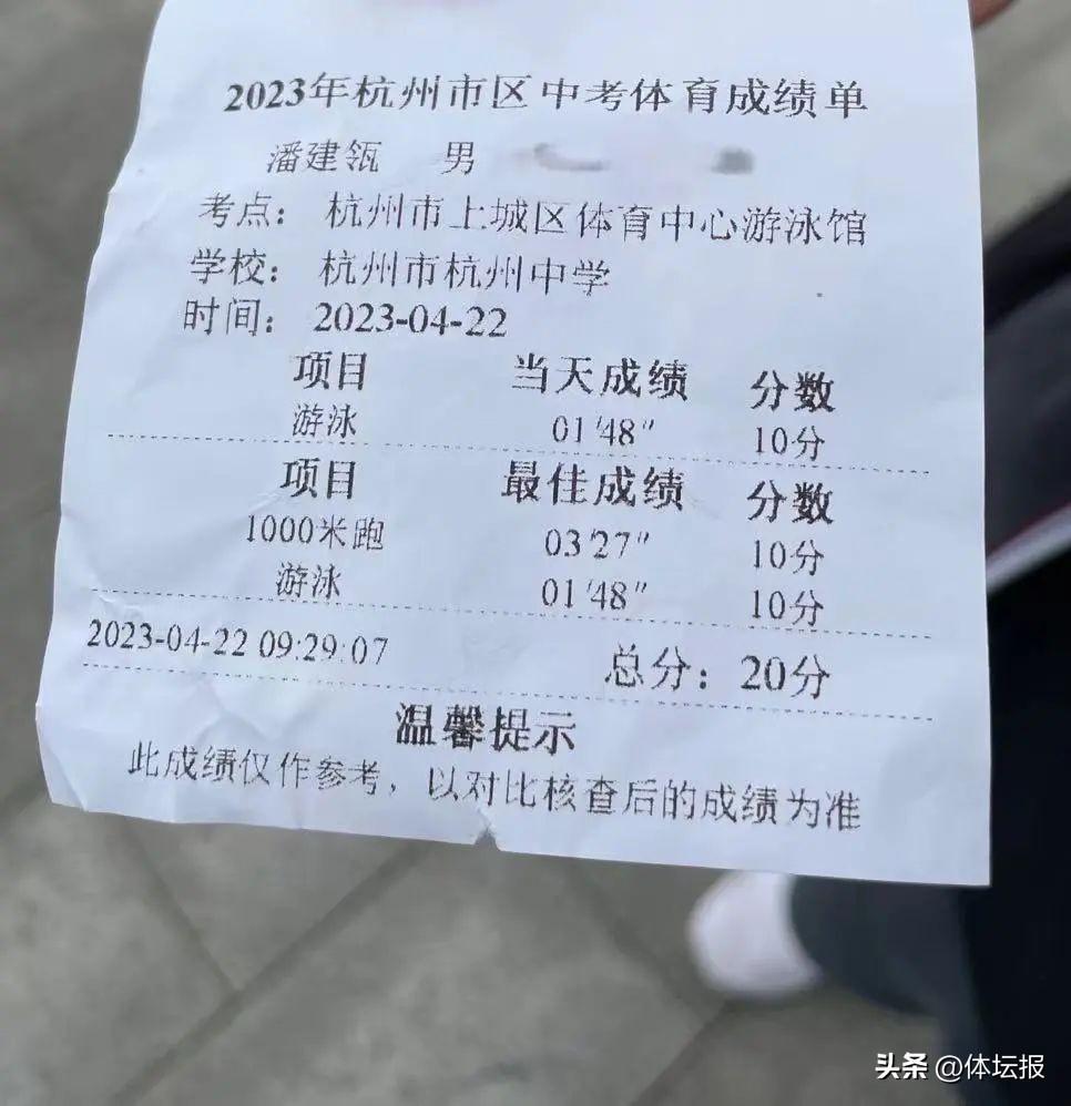 上午9點多,較早開考的杭州中學大部分學生已完成考試。潘建瓴報考了1000米跑和游泳兩個項目,上週1000米跑取得滿分,今天游泳又以1分48秒的滿分成績圓滿收官。他感嘆道:“超出預期了!比我平時快了十幾秒。”