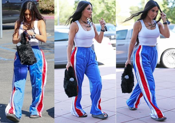 本週,42歲的金卡戴珊(Kim Kardashian)現身千橡市,身着自家品牌Skims的套裝,短款背心搭配紅白藍相間的直筒運動褲,香肩露出,大秀極致身材,上半身看着更爲飽滿,前凸後翹的比例非常明顯,即便是一個簡單背影,都能感受到她的豐腴,長髮垂腰,走路帶風!