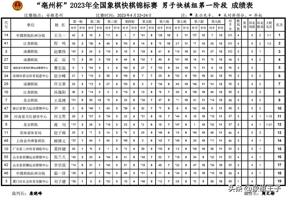 4月24日,2023年全國象棋快棋錦標賽預賽九輪的比賽在安徽亳州戰罷,男子組王天一奪得預賽第一,程鳴第二,趙攀偉第三,孟辰第四,半決賽王天一VS孟辰,程鳴VS趙攀偉。女子組李沁、梁妍婷、吳可欣、劉歡分獲前四,半決賽李沁對劉歡,梁妍婷對吳可欣。半決賽下午三點開打,象棋王子全程直播。
