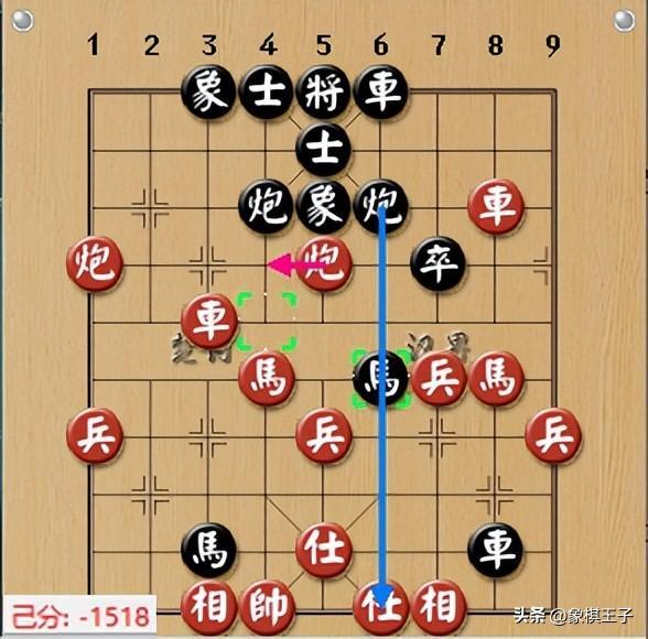 特大殺手殺術迅猛,黑方升炮一步,雙炮膽子炮連環,回馬連躍,兩個踢踏,馬3退4、馬4進6,帶攻必喫紅棋一子。