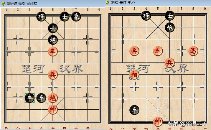 此間吳可欣與梁妍婷一戰,吳姐後手車炮卒單缺象對車炮兵光帥,車炮兵卒殘棋勝出,劉歡先手與李沁,車馬雙兵單相對車炮單士致勝。