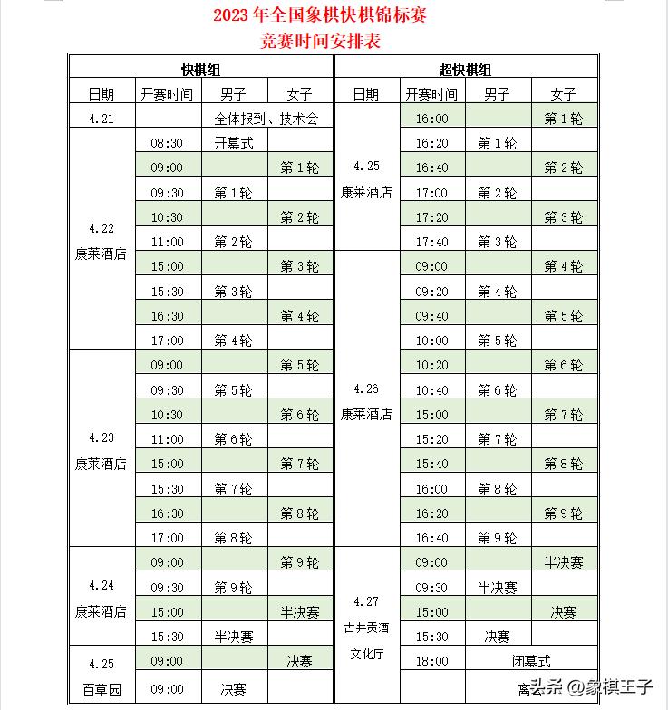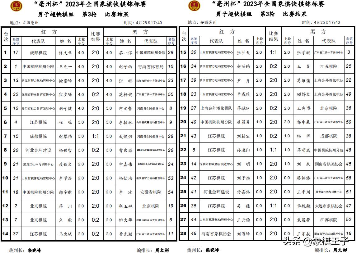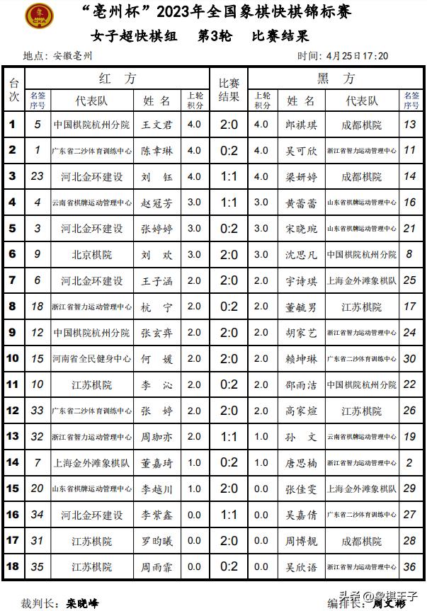 4月25日,2023年全國象棋快棋錦標賽超快棋組前三輪比賽在安徽亳州戰罷,男子組王天一力奪三連勝,與許文章、徐崇峯、劉子健、莫梓健,五人同爲6分,女子王文君、吳可欣取得三戰全勝。象棋王子持續全程直播。