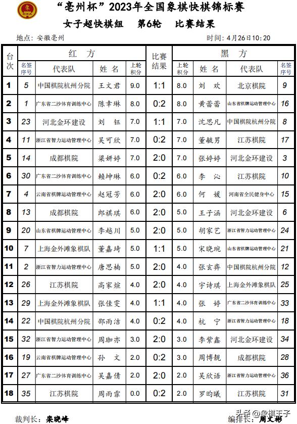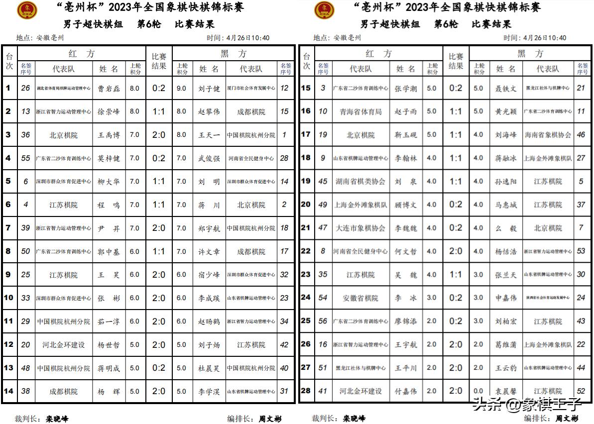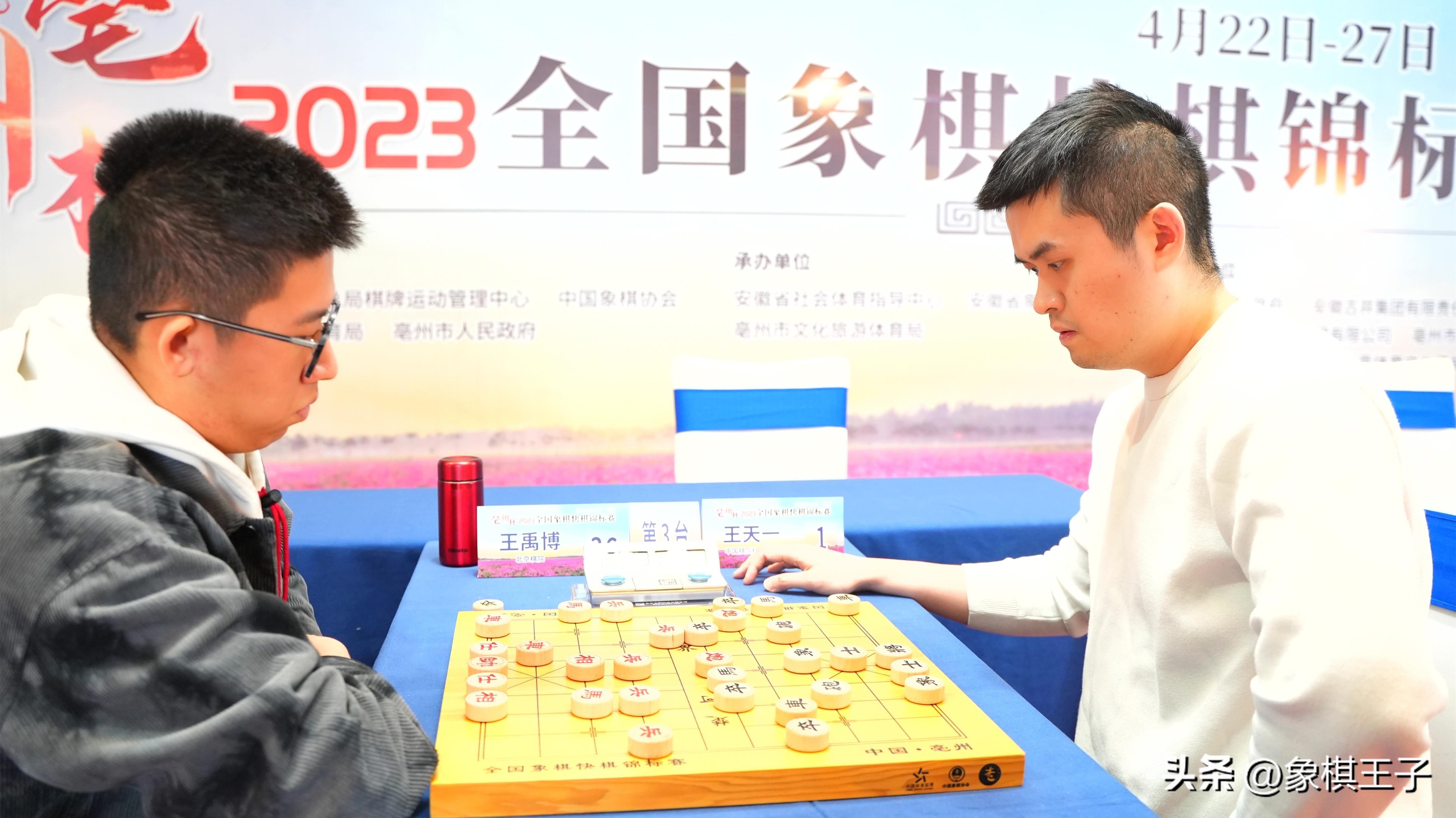 4月26日,2023年全國象棋快棋錦標賽超快棋組前六輪比賽在安徽亳州戰罷。男子組王天一意外手滑車敗於王禹博,六戰積8分,出線告急,劉子健11分領先,徐崇峯、趙攀偉、王禹博、武俊強、尹昇9分,王天一、蔣川、柳大華等十人8分。女子組王文君、黃蕾蕾10分居首。象棋王子全程直播。