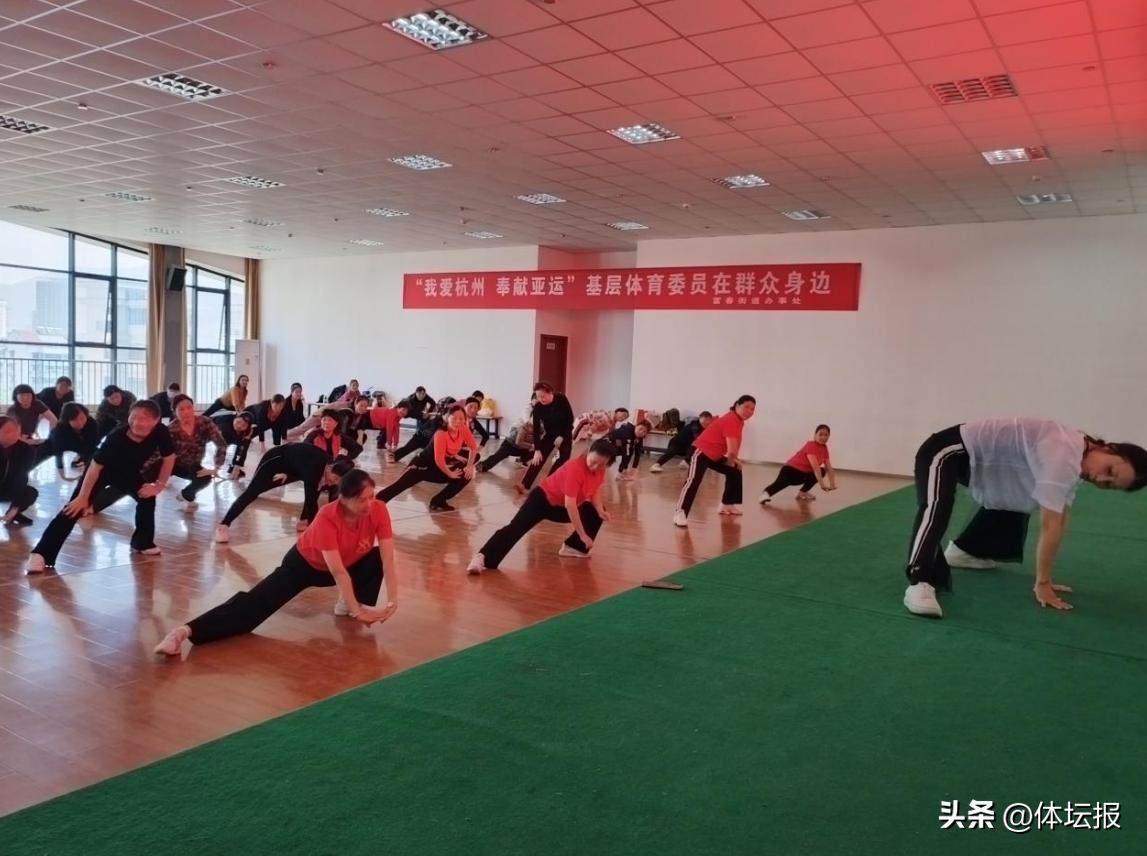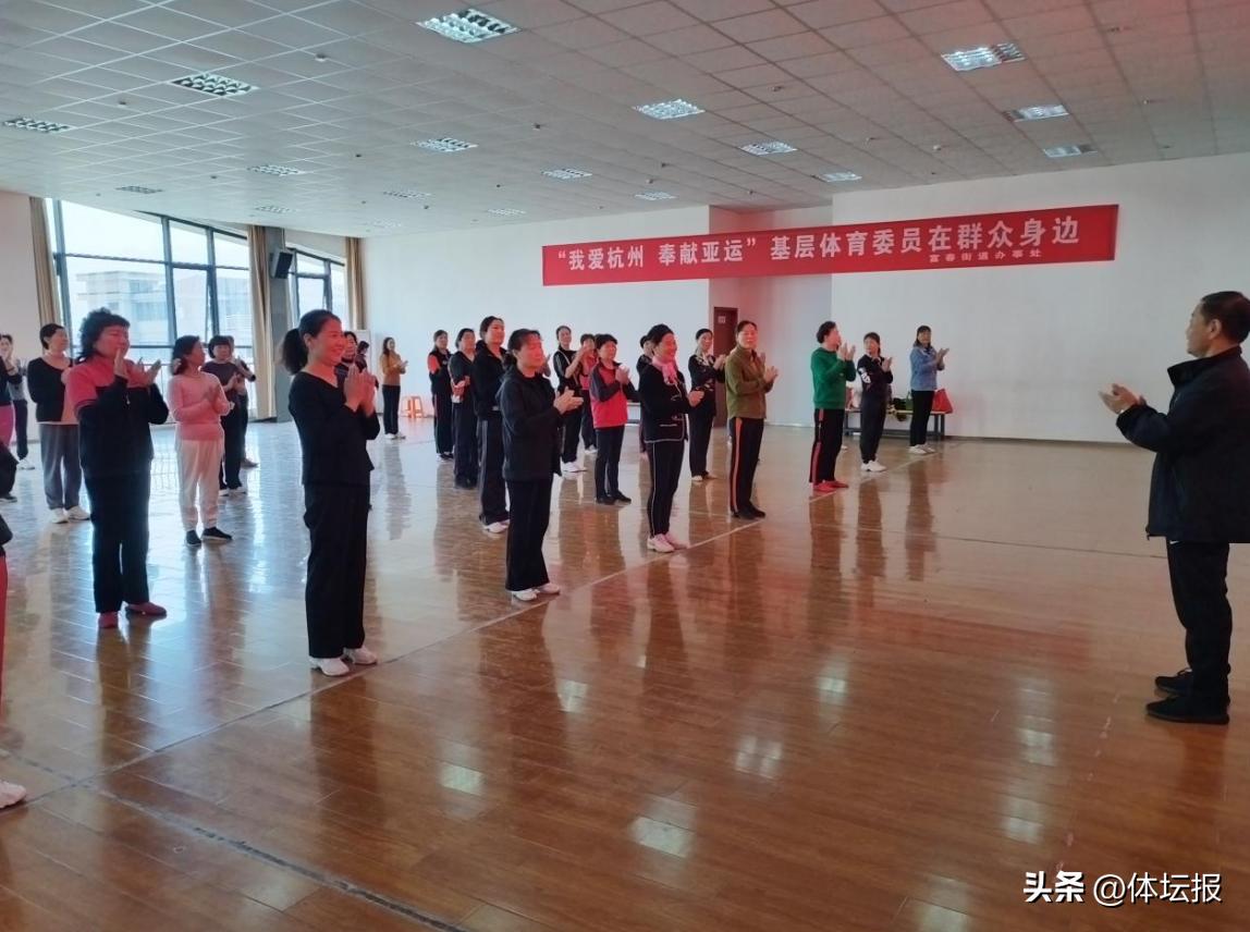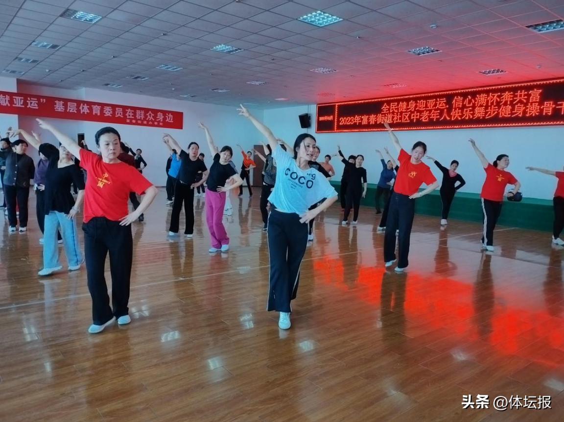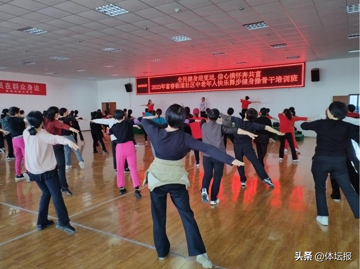 4月26日上午8點不到,在杭州市富陽區老年健身中心訓練大廳裏就音樂陣陣,舞者翩翩--爲加快培養快樂舞步健身操運動的骨幹力量,擴大快樂舞步健身操運動的受衆面、普惠性,由杭州市富陽區老年人體育協會和富春街道老年人體育協會舉辦的“全民健身迎亞運 信心滿懷奔共富”社區快樂舞步健身操骨幹培訓班在這裏舉行。有33個社區選派70位骨幹學員參訓。