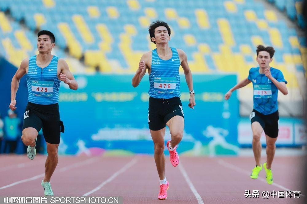 隋高飛、張海健、王勝傑(左至右)在男子100米決賽中