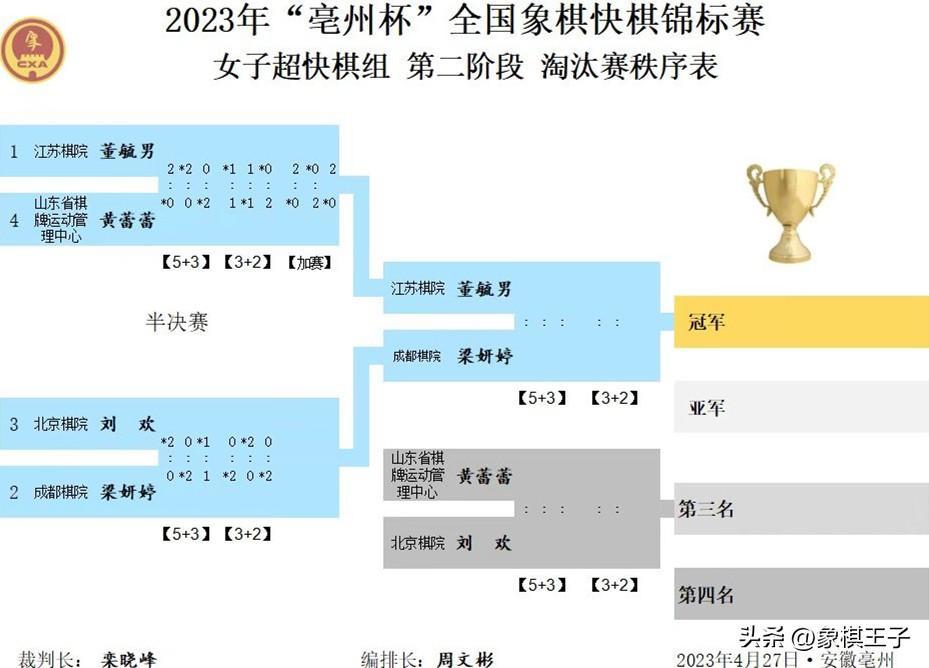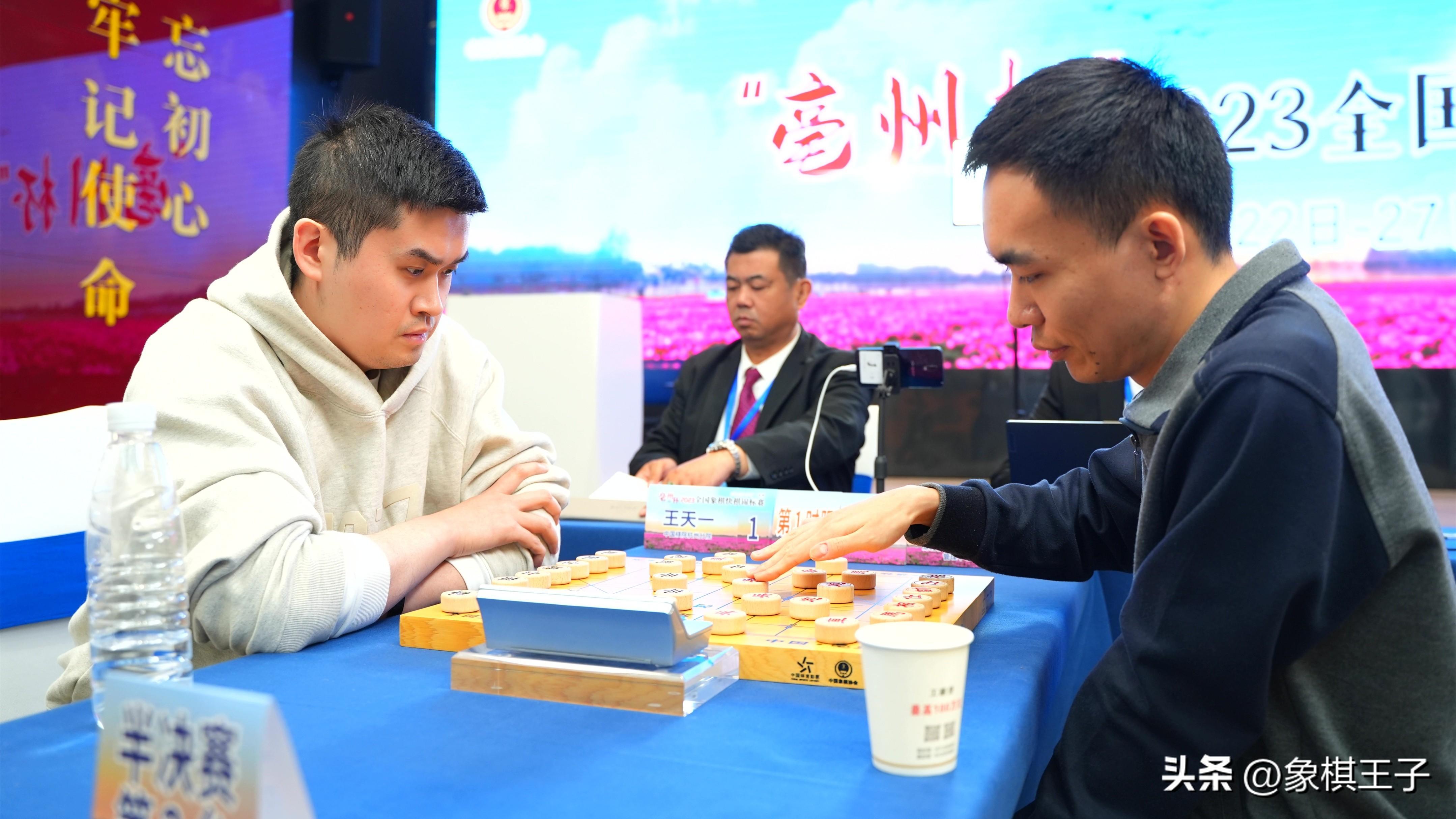 4月27日,2023年全國象棋快棋錦標賽超快棋組半決賽在安徽亳州戰罷,男子組中,王天一以12比0擊敗曹巖磊,挺進決賽,王禹博7比5險勝程鳴,王天一、王禹博會師決戰,大小王決鬥。女子梁妍婷、董毓男分別淘汰劉歡、黃蕾蕾,進行冠軍爭奪。冠亞軍決賽下午三點,象棋王子全程直播。