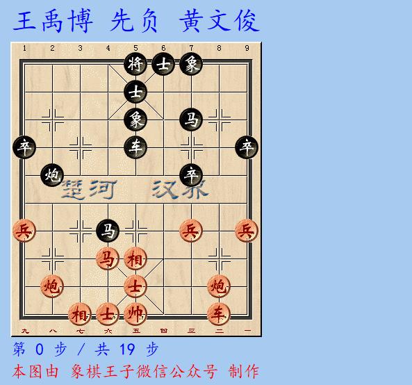 紅棋終於不敵,車完全無法動身,黑棋架上中炮,雙馬靈動,黃文俊以棄馬踩仕之威,強行要借勢喫掉紅車,紅方告敗,王禹博認負。