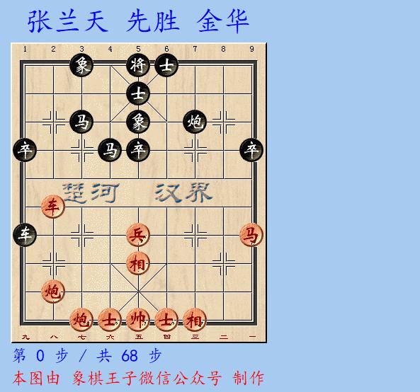 山東隊戰將張蘭天出擊新疆隊進化,張蘭天發揮不俗,在盤末捕獲一子後,以車馬炮兵對車馬勝出。