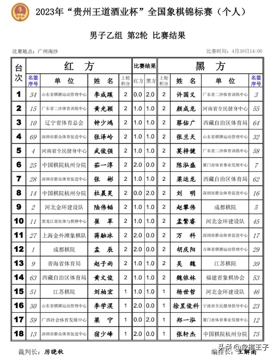 4月30日,2023年全國象棋個人錦標賽男子乙組第2輪比賽在廣州南沙戰罷。孟辰、許國義、茹一淳、劉明、蔣融冰,五人奪得二連勝領先。孟繁睿後手戰平崔革,1勝1平。萬科不敵蔣融冰,遭遇首敗。
